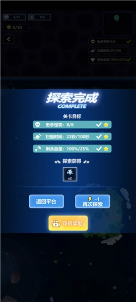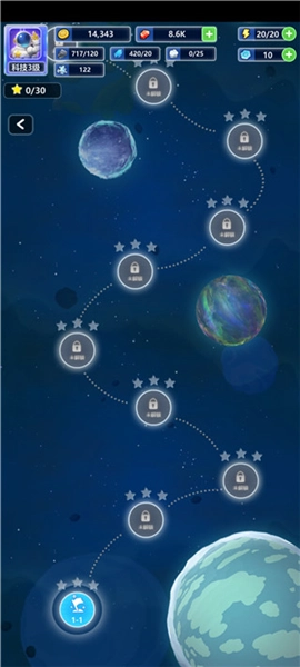 这款游戏设有众多关卡,点击关卡图标就能让宇航员开启探索之旅,冒险途中会有各类挑战与奖励等待着你。在星际航行时,记得收集资源,它们能用来建设基地、升级飞船等。