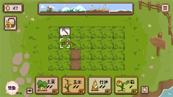 完成土地开垦后,挑选下方提供的作物种子(例如土豆),点击已经开垦好的土地,即可完成播种操作。