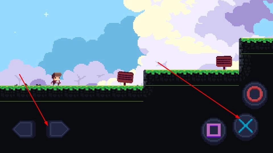 界面左下角有两个深色菱形的左右方向控制键,用于操控角色横向移动;右侧则分布着功能按键,其中紫色方形是跳跃键,蓝色叉形按键可触发攻击或交互操作,玩家需根据关卡需求灵活运用这些按键。