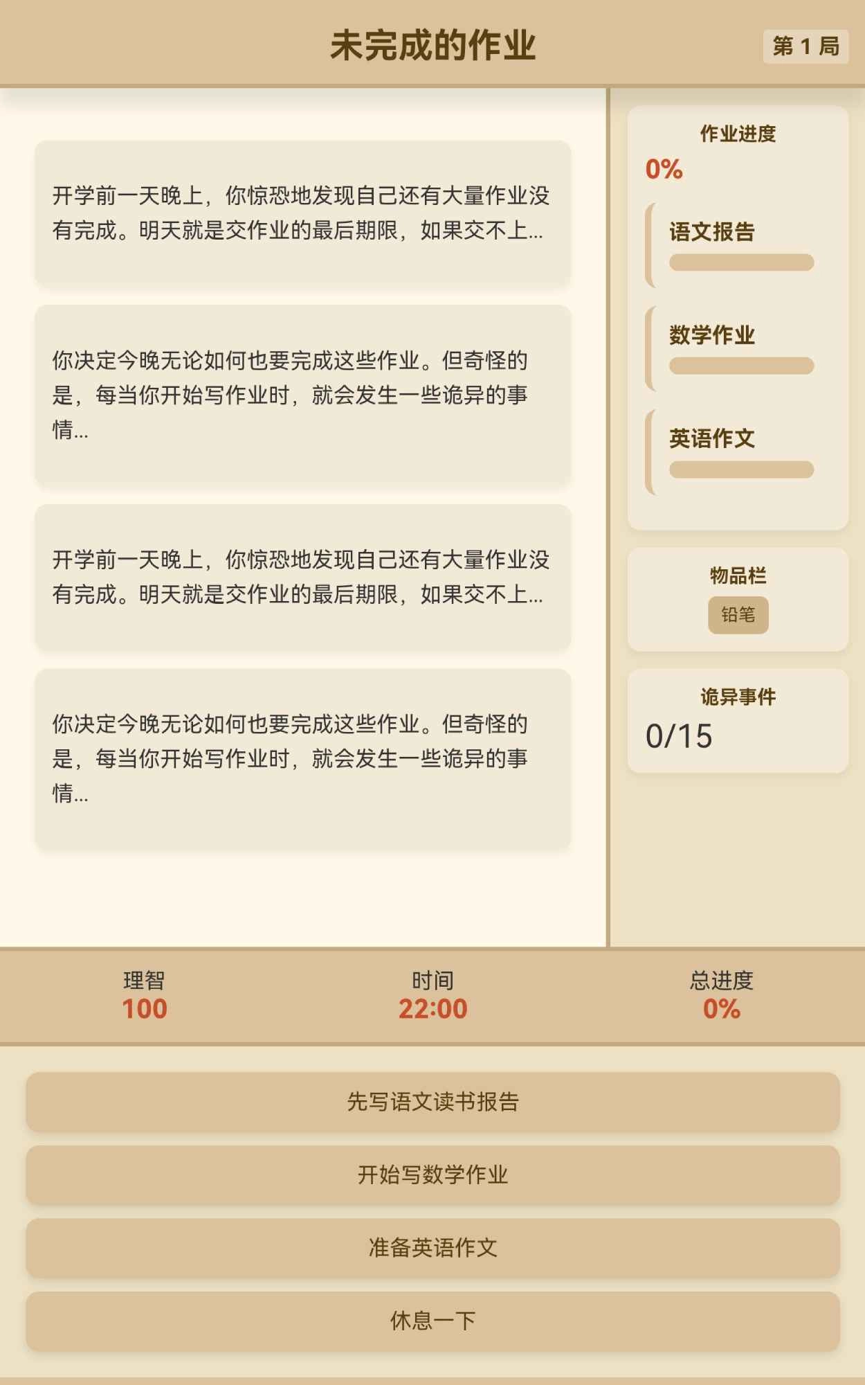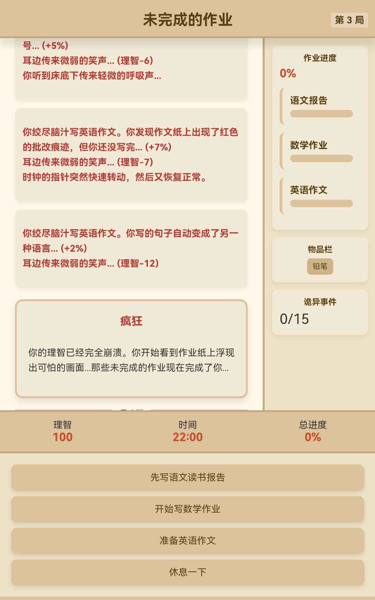 玩家要在限定时间里,通过挑选先做语文、数学、英语哪门功课的作业,或是选择休息,来推动游戏进展。在此过程中,完成作业能提高对应科目的进度,不过也会伴随理智的消耗,原因是做作业时会随机发生诡异事件,对玩家的状态产生影响。而休息不仅能恢复部分理智,还有可能找到实用的物品。