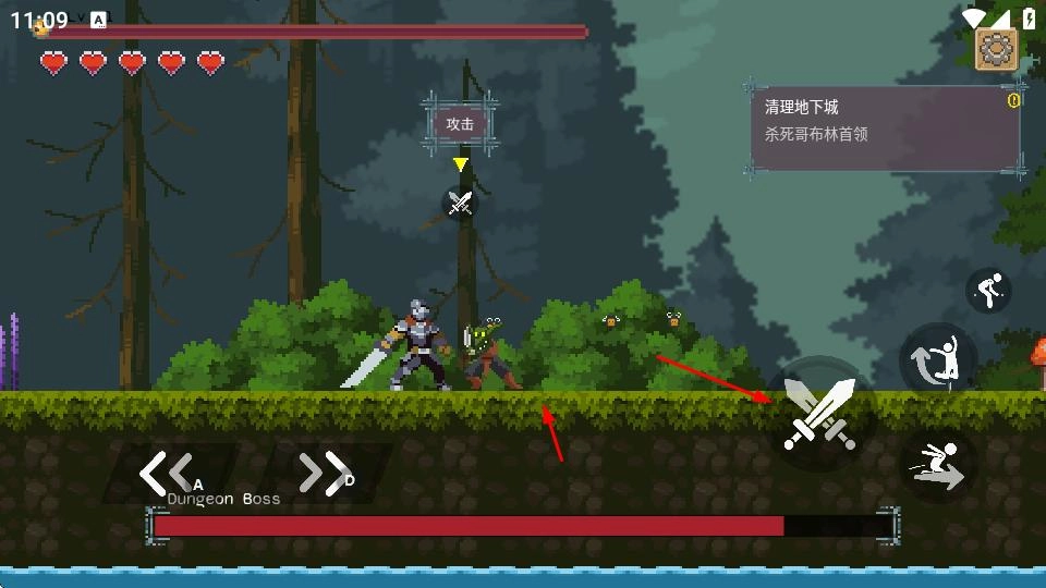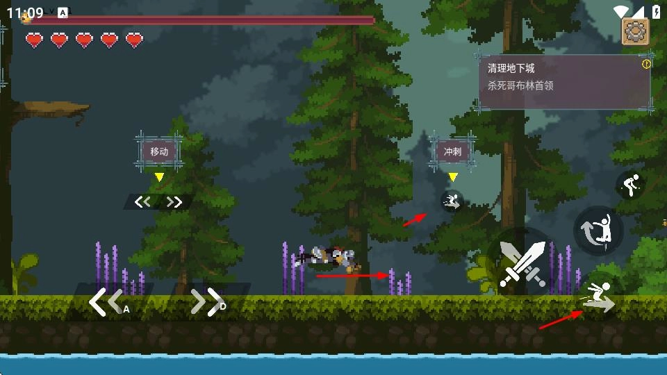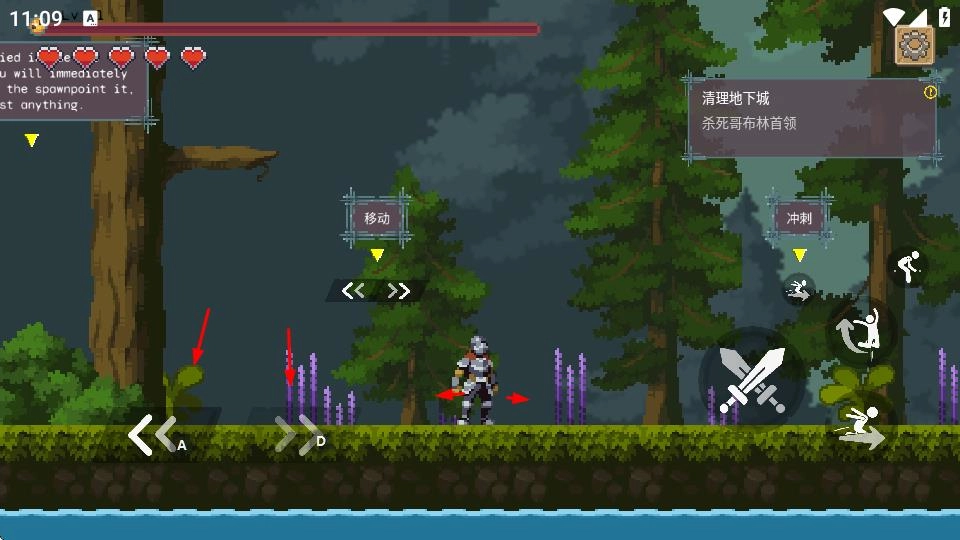 在森林这类场景里,你可以用左边的AD键来操控角色移动,点击右侧的冲刺按钮还能让角色快速前进,借此灵活调整走位去探索整个场景。