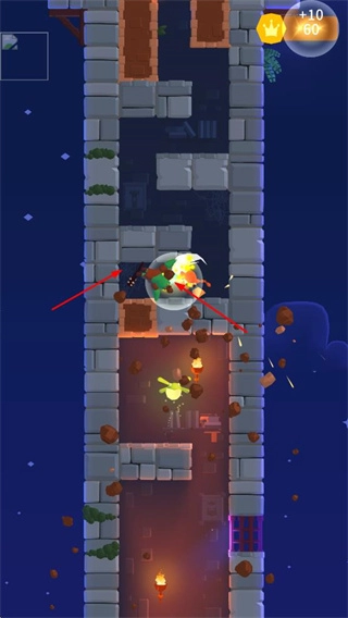 玩家操控角色在塔楼般的竖版场景里向下移动,途中会碰到敌人以及能够互动的元素。