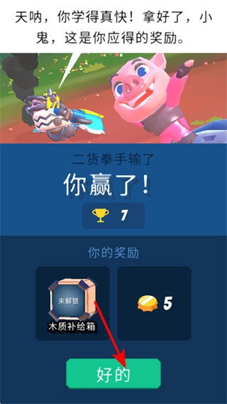 战斗获胜后,点击“好的”按钮即可领取奖励。奖励领取是积累资源的重要环节,领取后能获得金币与补给箱,同时解锁角色强化道具。