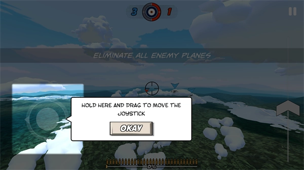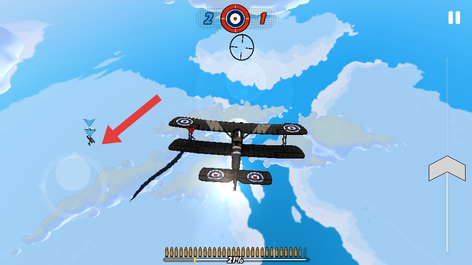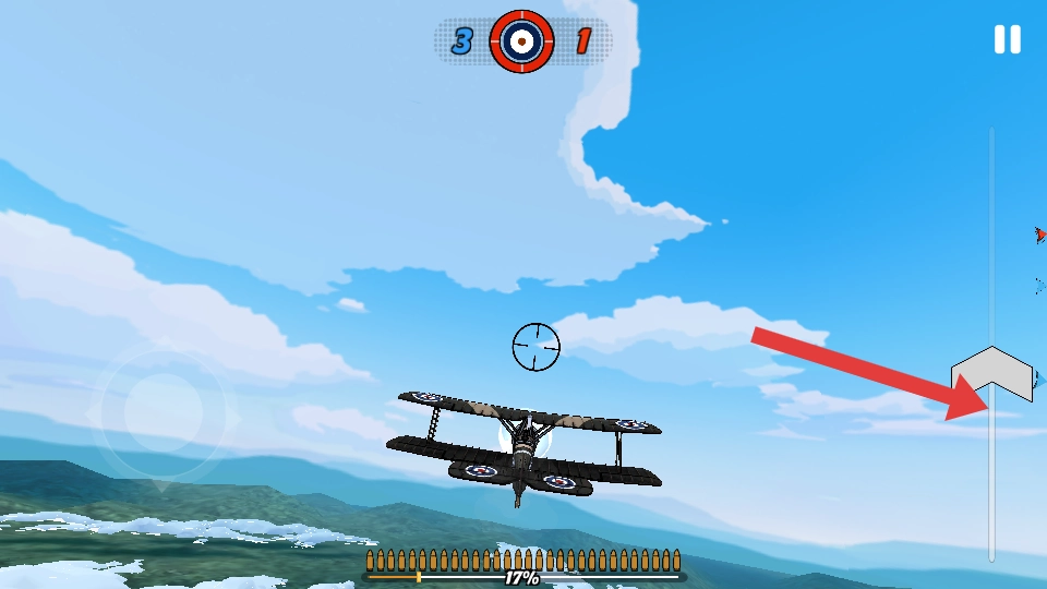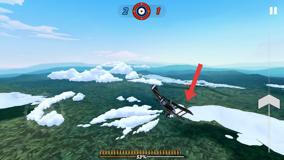 在空战游戏里,玩家要操控双翼飞机在空中飞行,借助右侧的方向指示来调整飞行方向,这是完成任务的基础操作。