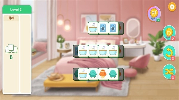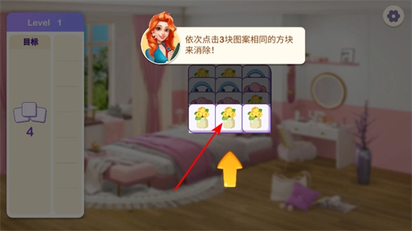 消除方块:在消除关卡里,点击3个图案相同的方块就能消除它们,完成关卡目标后,获得的奖励可以用来改造房间。
