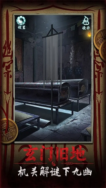 走进正屋把盆栽拿出来,带到假山前面摆放好,按照线索调整它的位置来得到八卦盘,再把八卦盘嵌入棺材的凹槽里。