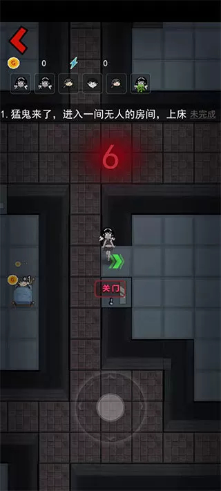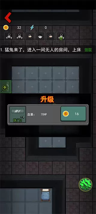 开局任意挑选一个宿舍,不用在乎倒计时,在鬼出来前都是固定给30金币,进房间后第一时间升级床到2级,并建造2级铁门.