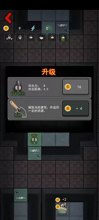 4、开局先建造2-3个初级炮台,抵挡住鬼的第一波攻势,有金币优先升级门和炮台