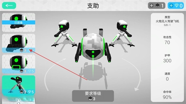 在军械库中能够更换支援机器人的类型,多数支援机器人设有等级门槛,要达到相应等级并消耗钻石才能购买。