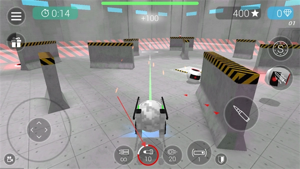 在场景中,机器人不可越过红色标记的区域,点击下方的子弹类型即可切换机器人所使用的武器。