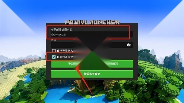 在本站完成安装后,打开并进入游戏。您可以随意输入一个邮箱(无需填写密码),勾选“以离线登录”选项即可进入;当然,也可以选择使用微软账号进行登录。