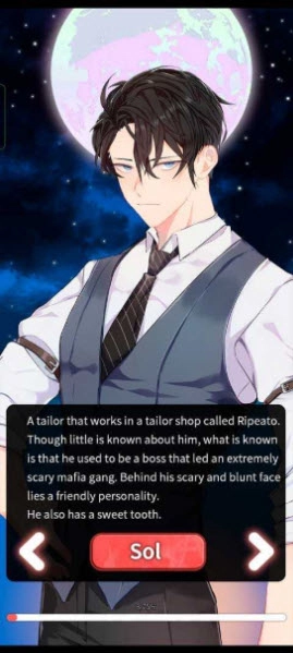 Sol:在Ripeato裁缝店工作的一名裁缝。人们对他了解不多,不过大家都知道,他以前是一个令人闻风丧胆的黑手党团伙头目。在他那张凶狠又严肃的脸庞之下,藏着友善的性格。
