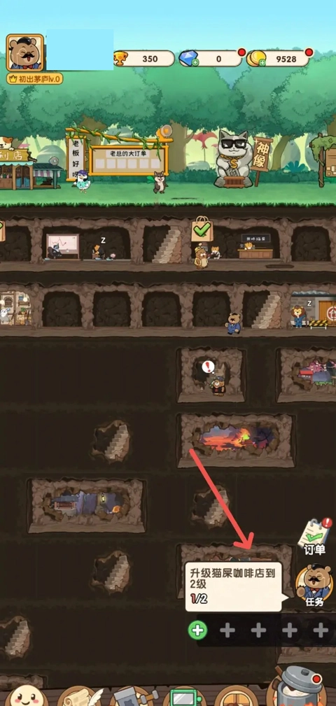 启动迷之实验室游戏后,找到并点击对应的任务按钮,以此来获取“猫屎咖啡店升级到2级”的目标指引。