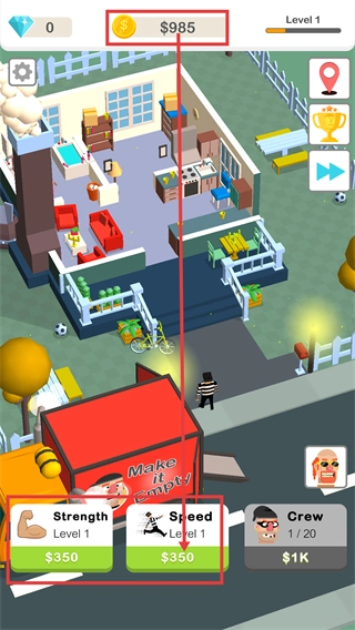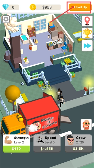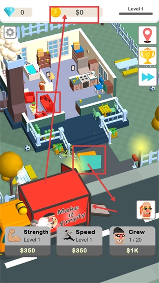 游戏开始时,先收集房间里【红色沙发】这类物品,把它们搬到【Make-it-Empty】卡车上。从【$0】的初始金币开始积累,由此开启靠盗窃发家的道路。