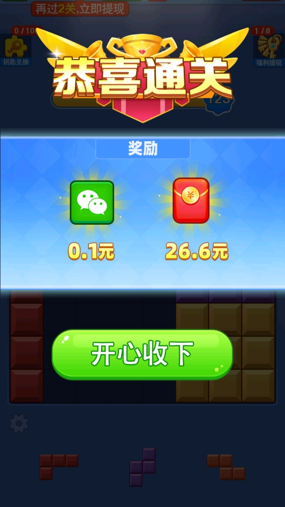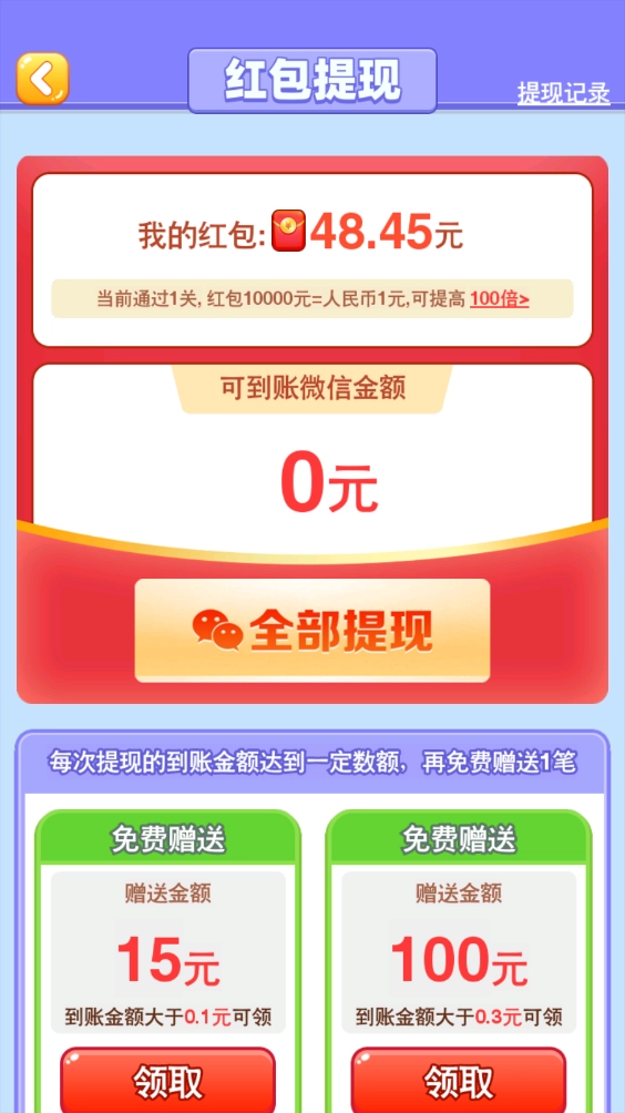 新人上线后跟着指引熟悉游戏规则,轻松闯过第一关、自己再玩会儿通过第二关,就能分别拿到0.1和0.25元的红包,实测都是秒到账!另外积累的红包还能按万分之一的比例兑换呢!