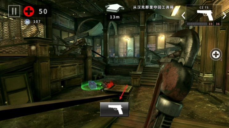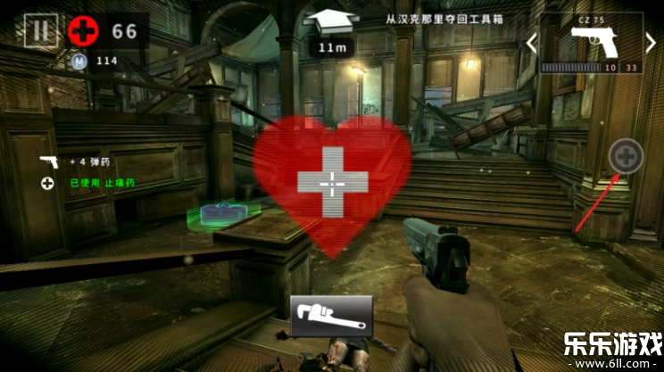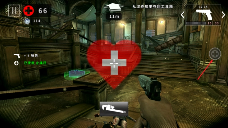 右侧的十字按钮是医疗道具,当你血量不足时,点击它可以恢复你的血量。