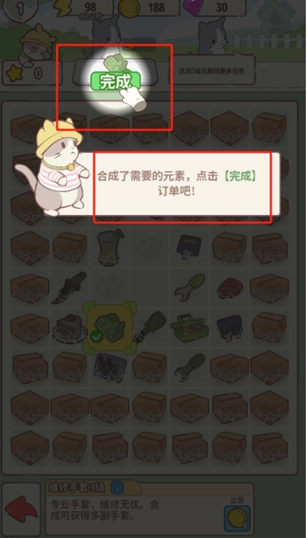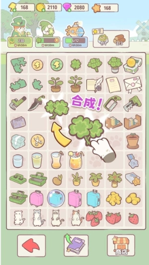 材料合成工坊:在庭院里收集基础资源,借助三消式的合并玩法,就能产出高级建材和猫咪零食。