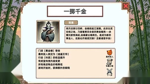 《小小侠客模拟器》是一款主打模拟玩法的武侠题材手游。在游戏里,玩家将化身初涉江湖的侠客,为了成长为声名远扬的一代大侠,踏上了充满修炼与战斗的冒险征程。这款游戏巧妙融入了Roguelike元素,玩家每一轮行动的结果都会随机变化,每次修炼所领悟的武功、战斗时的攻击效果都是未知的,这让玩家在游玩过程中能体验到更强烈的刺激感。热爱武侠题材游戏的玩家,可别错过啦!