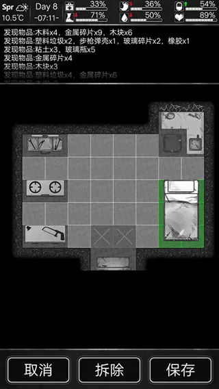 5、第一天搜寻一栋楼,把找到的家具擦拭干净后带回家,动手制作弓、弓箭、网子以及手提袋。之后继续搜寻其他地方,过程中只进行搜寻,不做拆解。当储备的食物足够维持几天的时候,就回家提升家具等级,制作铁铲和斧头,接着开始对家里进行改造拆解。