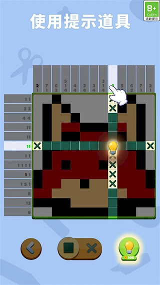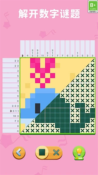 核心玩法结合了数织逻辑与拼图收集机制。玩家依据行列的数字提示进行涂色操作,逐步揭开隐藏的像素图案,每完成一道题目就能获取一块拼图碎片。