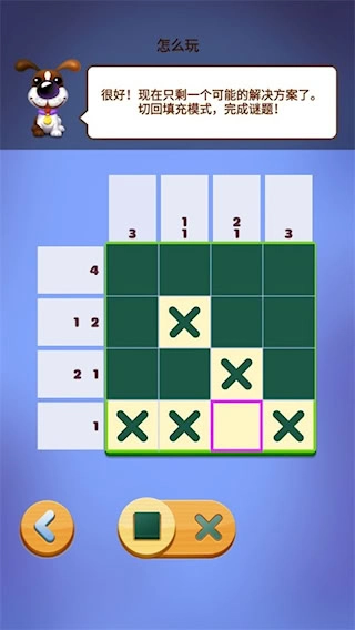 解答谜题的关键操作在于标记方格,第一步要把交互模式切换到填充状态。