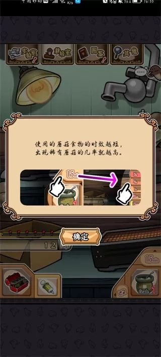 只要玩家点击食物按钮,菇菇便会开始生长,直至达到玩家设定的时间结束。而且,玩家选用时间越短的食物,越有可能长出稀有菇菇。