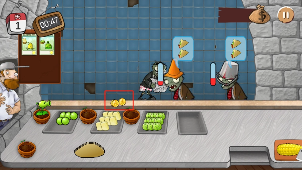 每个僵尸都具备一定的耐心值,只要在其耐心耗尽之前将沙威玛递送给僵尸,就能获取金币。