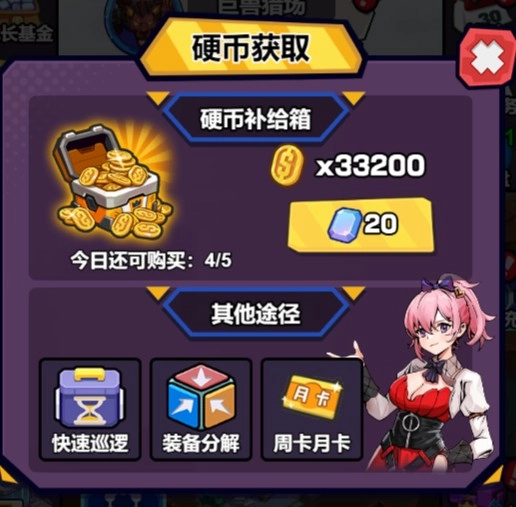 主要获取途径包括硬币补给箱、快速巡逻、装备分解以及周卡月卡。