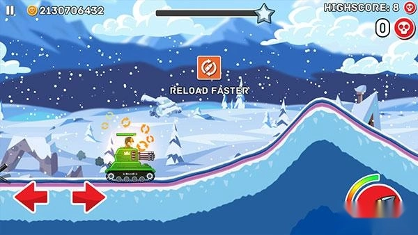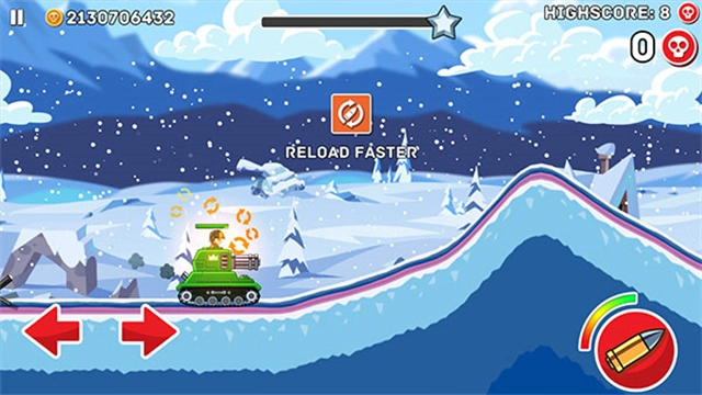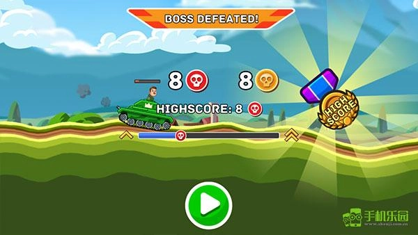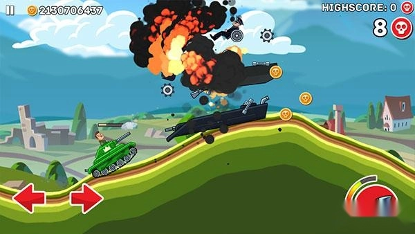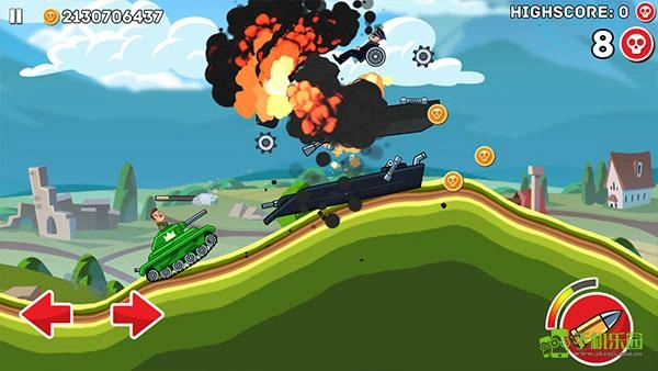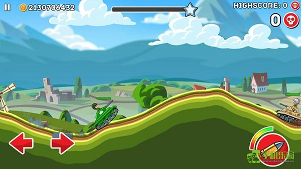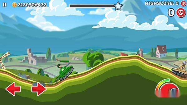 接下来正式进入游戏,左下角的左右箭头分别控制战车的前进与后退,右侧是射击按钮,头顶的绿色血条代表己方战车的血量,需注意以最小的损伤获取更多胜利。