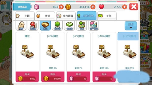 游戏里有上千种商品,像饮料、零食、蛋糕这类美食一应俱全,另外还有窗帘、地毯、货架之类的各类设施。