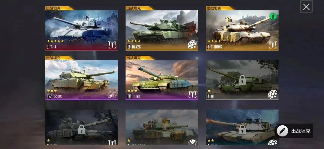 每辆坦克的最高等级均为13级。若要在战斗中使用坦克,需记得编辑【出战坦克】,该按钮位于坦克界面的右下角。