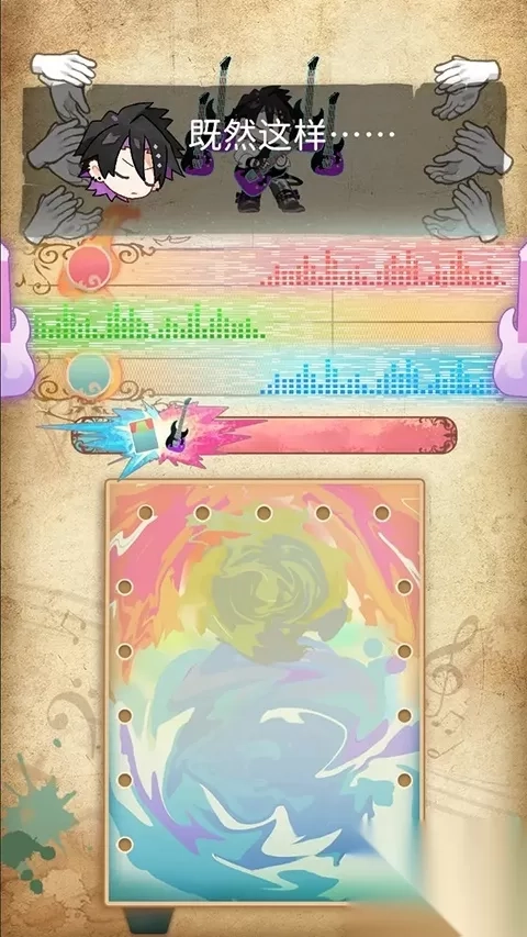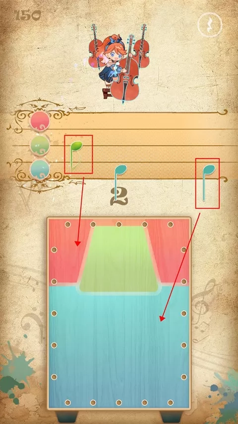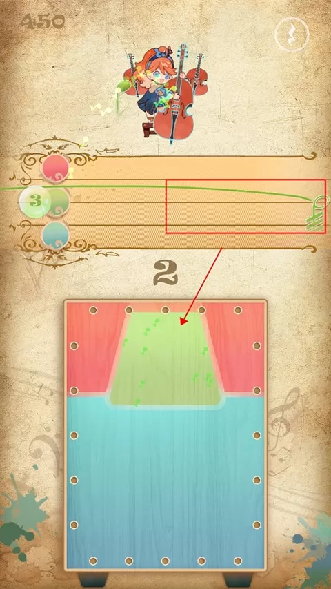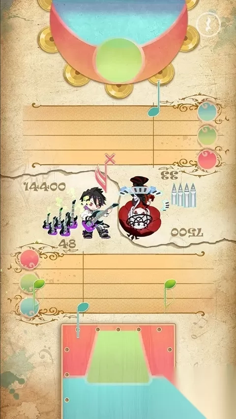 4、游戏的主要玩法为三色演奏,届时屏幕上方会出现音符,玩家需点击下方相应颜色来收集音符,同时也能够依据鼓声节奏进行击鼓操作。