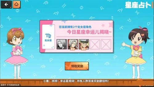 进入星座占卜的游戏界面后,首先看到的是两位可爱的女主——小春和京子,她们是这个玩法的主持人。