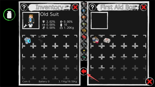 急救箱是一种需要耗时开启的容器,开启后点击屏幕中间下方的箭头,就能一键把箱内物品直接转移至自身背包。