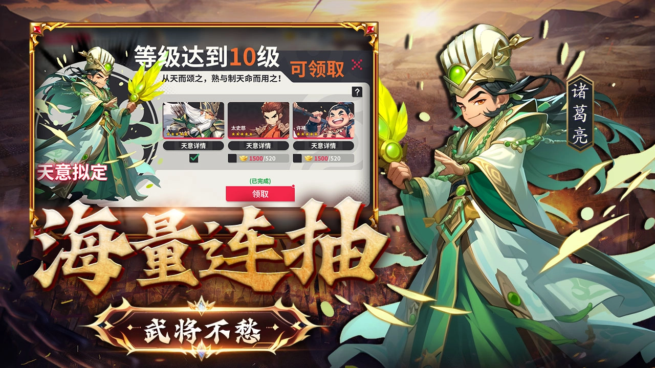 角色达到指定等级后,都能尝试三次十连抽,还能免费领取其中一组;普通天意拟定的话,也可以消耗元宝把所有奖励都领走,轻松就能组建出强力阵容。