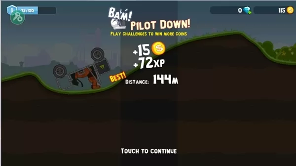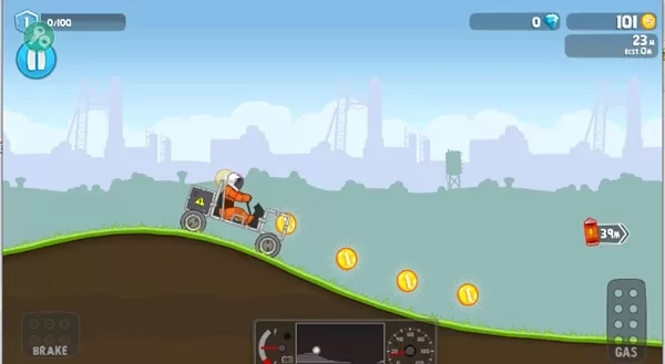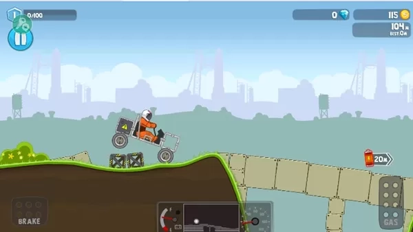 4、游戏的操作非常简单,玩法类似于登山赛车,如果车头翘起玩家就按住刹车;