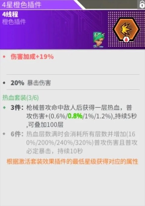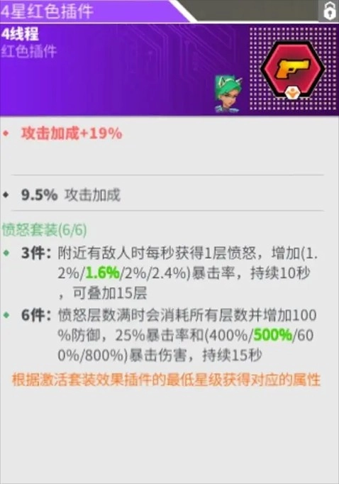 插件搭配推荐6愤怒加3热血,这是目前公认的最优组合。6愤怒不仅能带来高额的暴击与爆伤加成,还可提升100%的防御属性;而3热血与高射速的劳拉适配度极高,能快速叠加到100层buff。