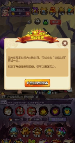 若玩家未能在限定时间内击败boss,系统将自动将其送回上一层关卡继续打怪,直至玩家主动点击挑战boss为止。
