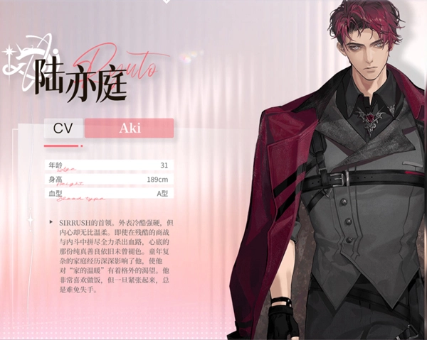 SIRRUSH的领头人。看上去冷峻又强势,内心却藏着极致的温柔。哪怕在残酷的商战和内部争斗里拼到筋疲力尽才闯出一条路,心底那份纯粹的善良始终没有改变。小时候复杂的家庭遭遇对他影响很深,让他对“家的温暖”有着特别强烈的向往。他很爱下厨,可一紧张起来,就总会不小心搞砸。
