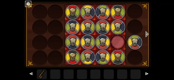 进入左侧房间后,点击右侧墙壁上的骷髅摆件,参考一楼壁画的线索,将其摆放成与帽子相同的样式即可。