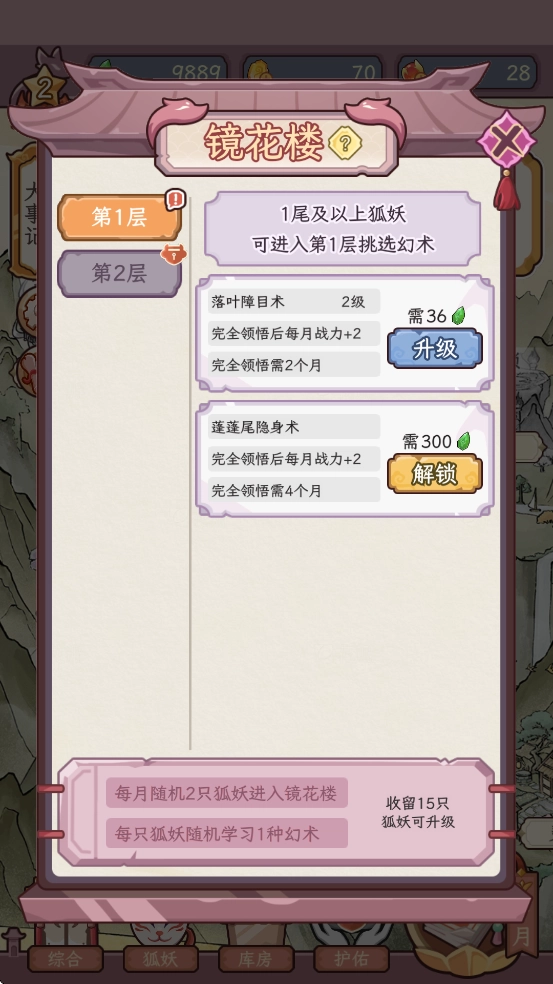 狐妖若想在镜花楼修习更上乘的幻术、于水月坊钻研更精妙的心法、在玉食府品尝更珍馐的美食、去汤苑体验更惬意的沐浴,或是到仙法楼研习更超凡的仙法,都需要具备更高的气运才行。