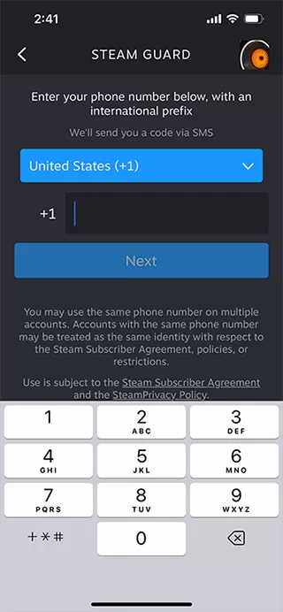 2、接下来,您将输入一个电话号码,我们可以通过短信确认该电话号码。如果您无法访问您的 Steam 帐户,您可以通过要求 Steam向该电话号码发送短信来快速恢复它。输入您的电话号码。从下拉列表中添加国际前缀。