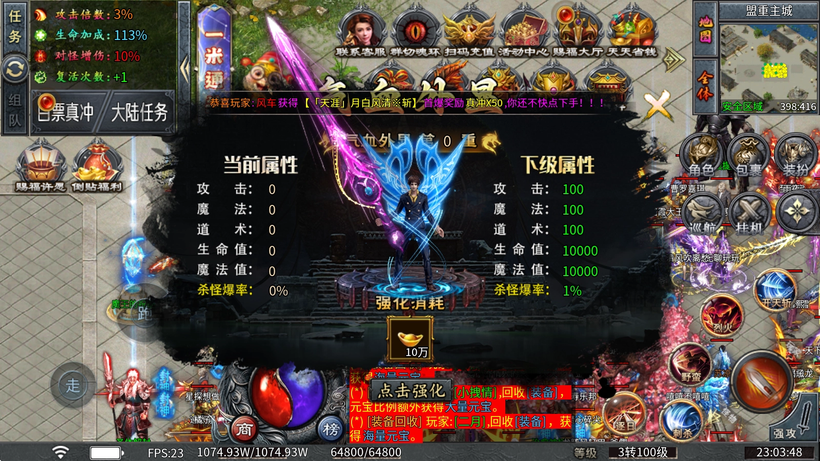 血气外显:消耗元宝就能进行强化,强化后不仅能提升攻魔道这类基础属性,还可以增加杀怪时的爆率。