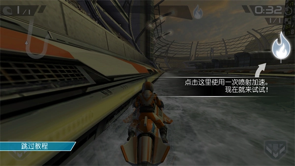 右上角有个火焰图标,点击它就能让快艇直接加速。