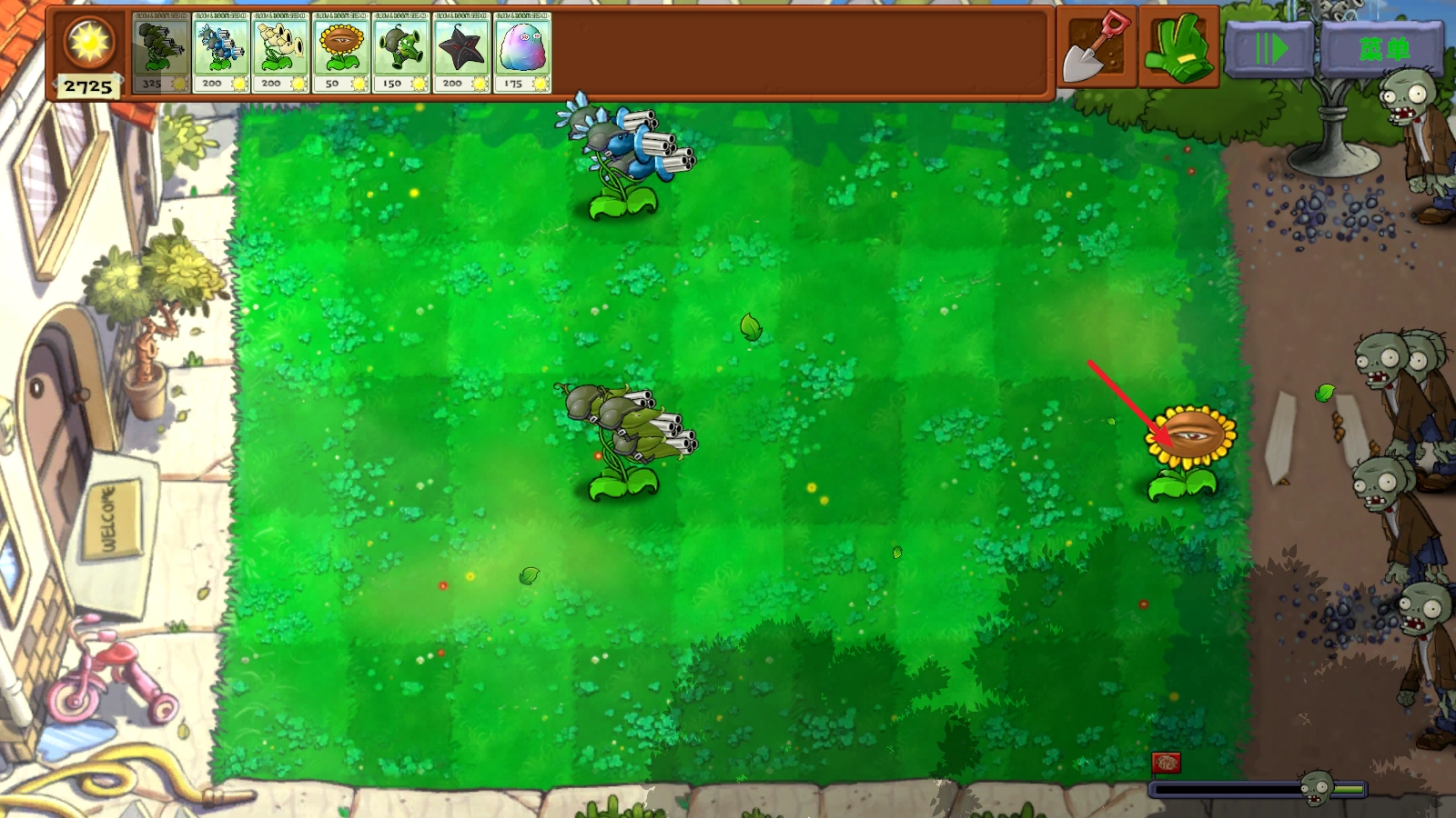 接下来我们就能着手种植植物了,这些经过改造的植物能力都很出色,像向日葵就不会受到攻击,我们可以直接把它种在第一排。