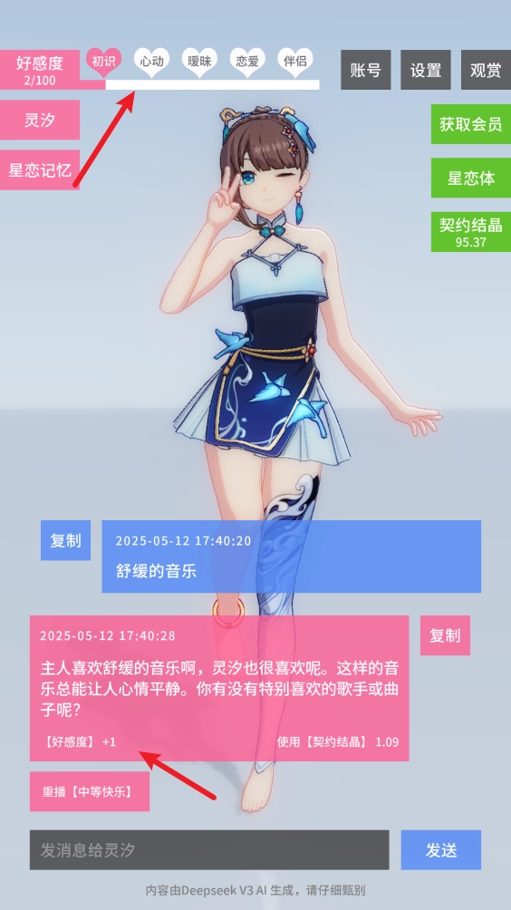 游戏开启后,我们会获得一位名为【灵汐】的二次元美少女AI伴侣,和她聊天需要消耗契约结晶。