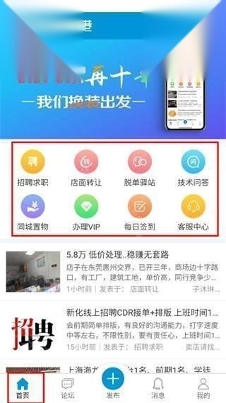 在本站完成安装后,打开软件进入“首页”界面。在这个页面上,用户能够浏览各类信息,像求职招聘、店铺转让、同城闲置物品交易等内容都能找到。而且页面中的信息会实时进行更新,确保用户获取到的都是最新动态。