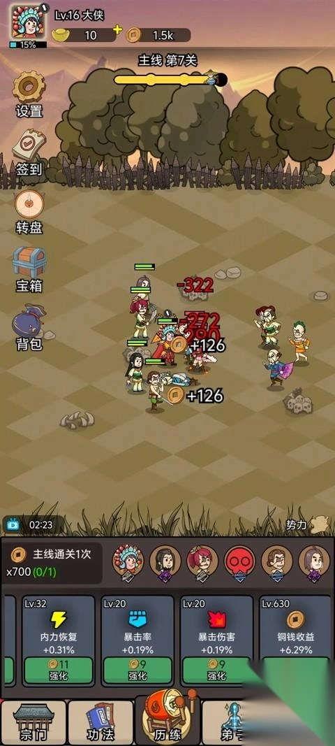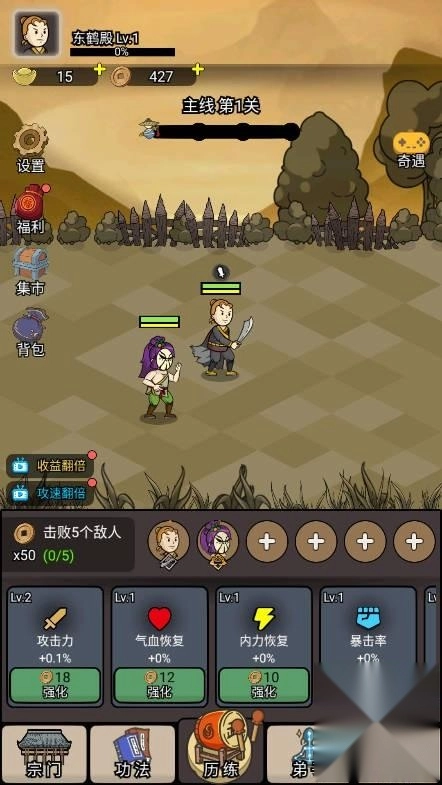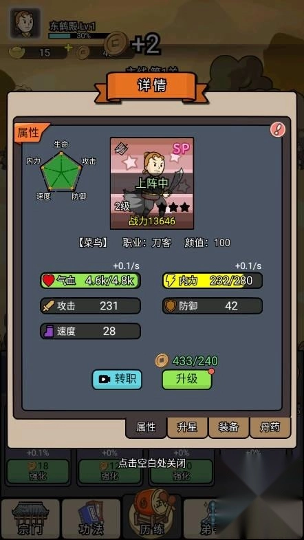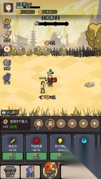 前期属性提升时,除了满足任务要求外,要尽量把收益相关的属性面板拉到最高,这样推图掉落的铜钱会特别多。有了足够的铜钱就能升级弟子,推图的速度也会随之加快。