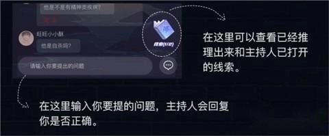 玩家知晓游戏剧情后,可在下方输入想提出的问题,主持人会告知你答案是否正确,点击右侧的线索按钮,就能查看已推理得出以及主持人已公开的线索。