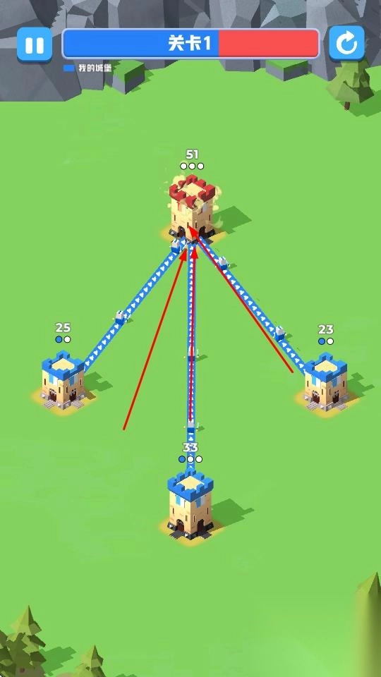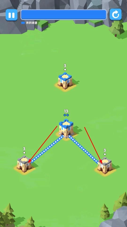 战斗过程中,借助兵力传输通道,统筹调配各城堡的兵力资源,为前线提供支援,以进攻敌方的红色城堡。